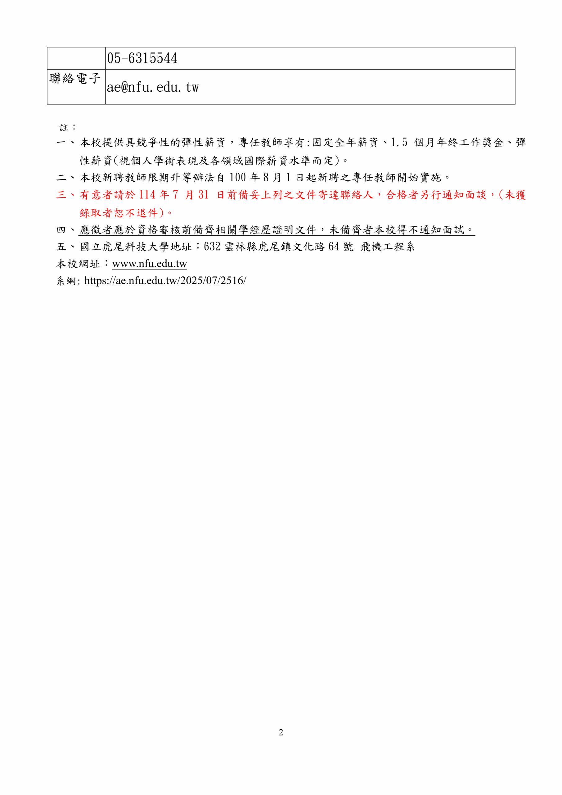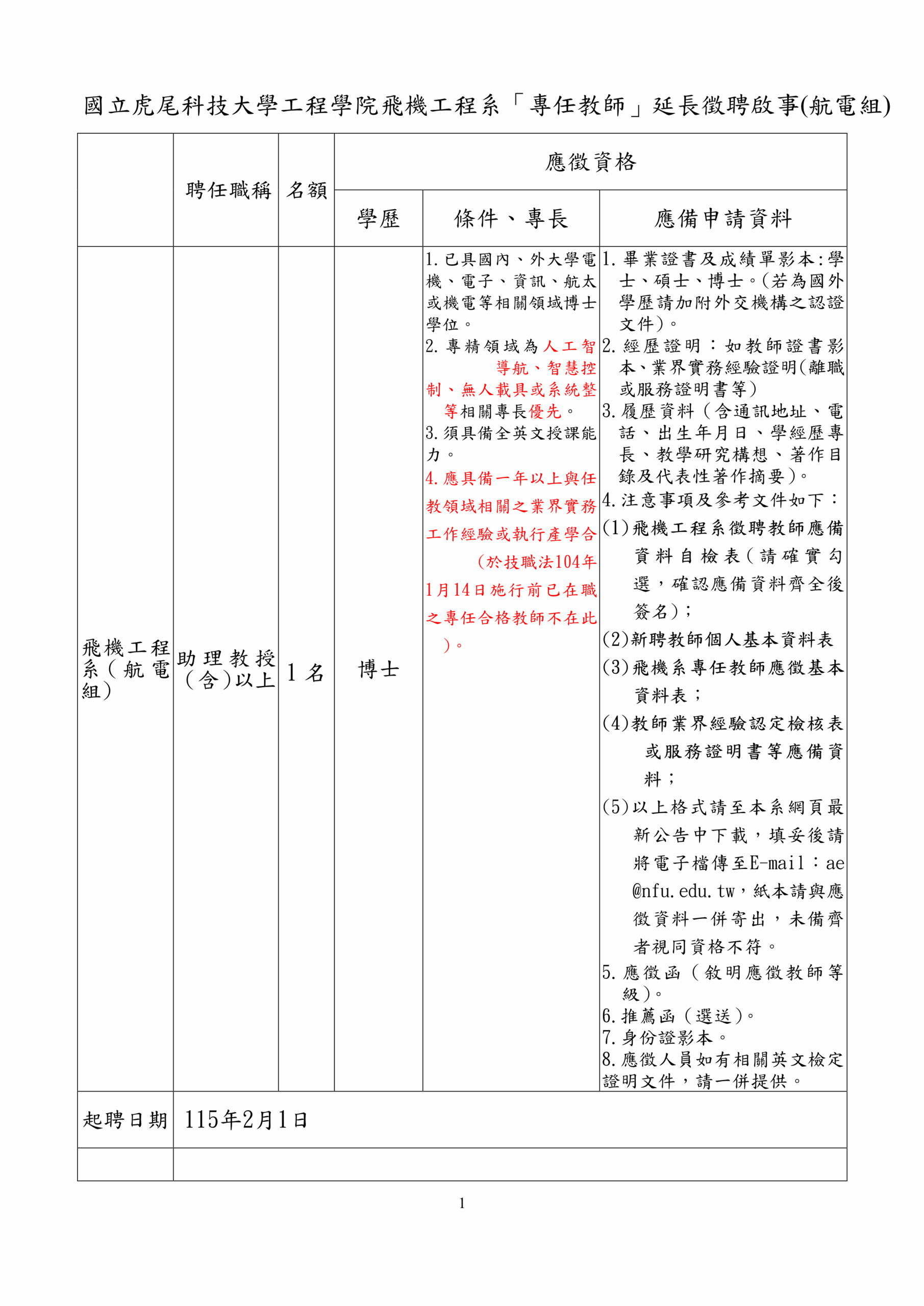 【延長公告-新聘-專任教師(航電組)】114學年度第2學期徵聘專任教師1名(公告至114年7月31日截止收件,郵戳為憑) 2025-07-08 AdminAdmin 【延長公告】飛機工程系專任教師延長公告啟事下載 飛機工程系專任教師應徵基本資料表下載 國立虎尾科技大學飛機工程系徵聘教師應附資料自檢表下載 新聘教師個人基本資料表111下載 擬聘專任教師業界經驗服務證明書(範本)下載 擬聘編制內專任教師業界經驗認定檢核表下載