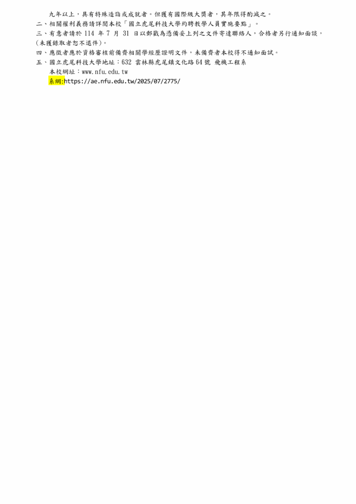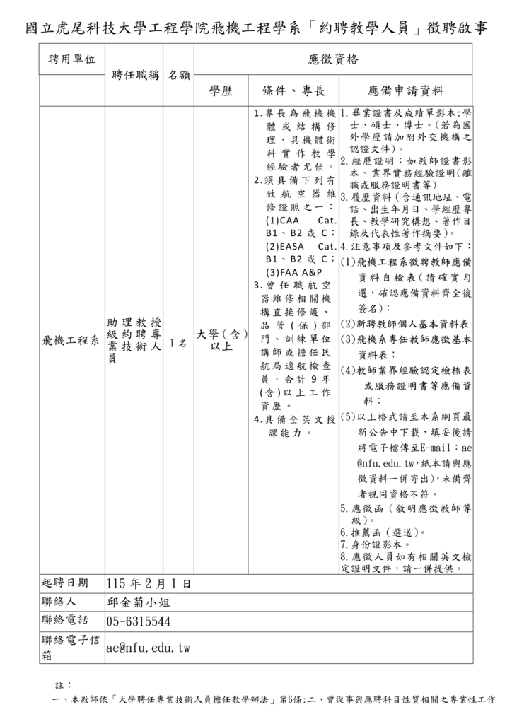 【延長公告-新聘-約聘教學人員】114學年度第2學期徵聘助理教授級約聘專業技術人員1名(公告至114年7月31日截止收件,郵戳為憑) 2025-07-08 AdminAdmin 延長公告-約聘教學人員公告啟事下載 飛機工程系專任教師應徵基本資料表下載 國立虎尾科技大學飛機工程系徵聘教師應附資料自檢表下載 新聘教師個人基本資料表111下載 擬聘專任教師業界經驗服務證明書(範本)下載